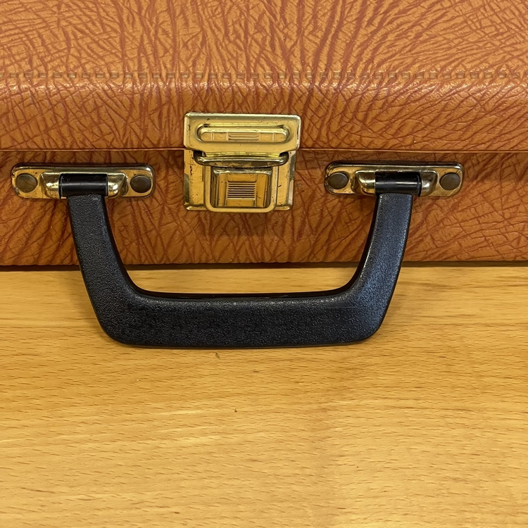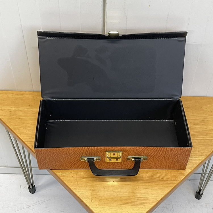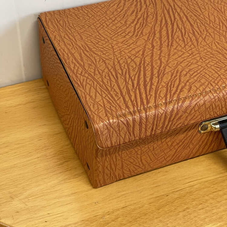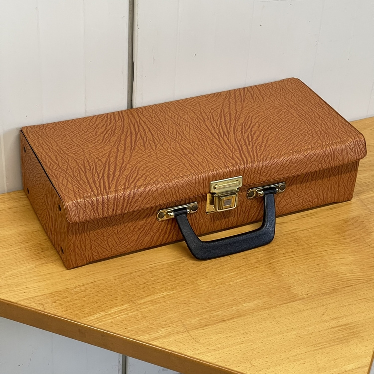 Vintage jaren 70 cognackleurig skai koffertje voor cassettebandjes. In hele goede conditie met goudkleurig werkend slotje en zwart handvat.