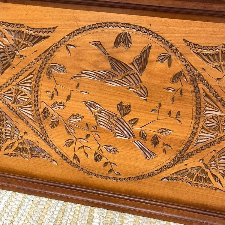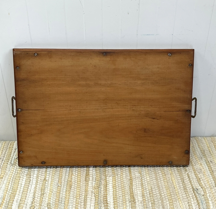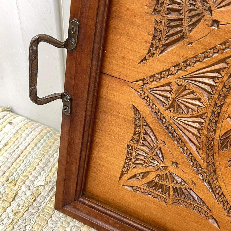 Artikelnummer: 3017 OverzichtFraai antiek Jugendstil dienblad met houtsnijwerk, echt prachtig. De rand erom heen is wat donkerder en heeft 2 koperen handvaten. Verkeert in goede conditie met normale sporen van gebruik. Het is behandeld met een voedende natuurlijke houtolie.