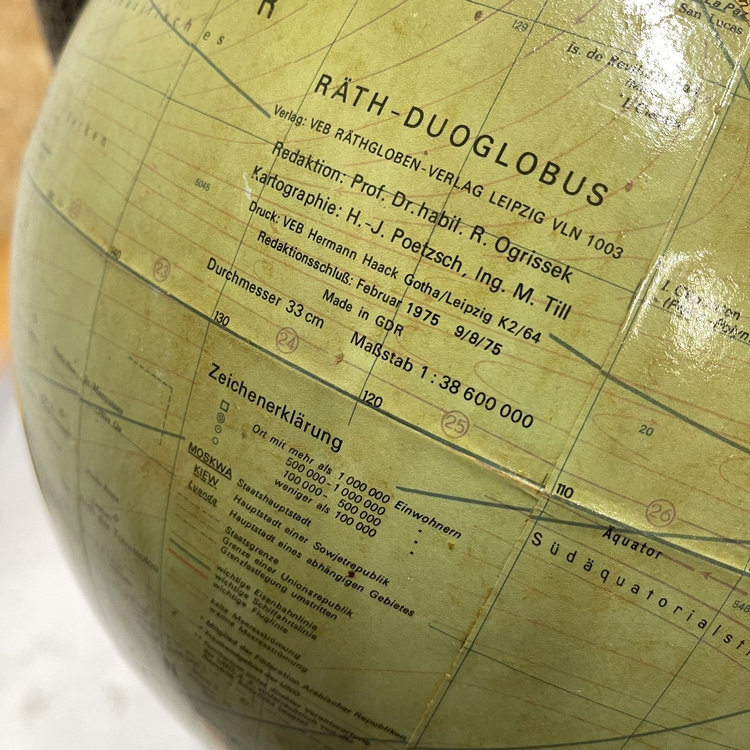 Artikelnummer: 3016 OverzichtGrote vintage globe van het merk Räth uit 1975. Het is een (werkende) lamp met snoer en schakelaartje. Heeft een mooie massief houten voet en verkeert in goede gebruikte staat met normale lichte sporen van gebruik. Is wat vergeeld in de loop der jaren. Een erg decoratief object...........