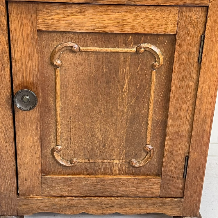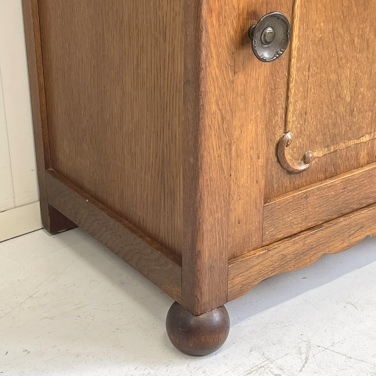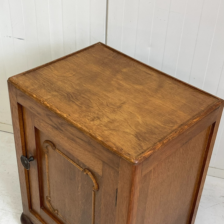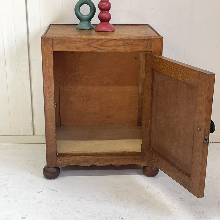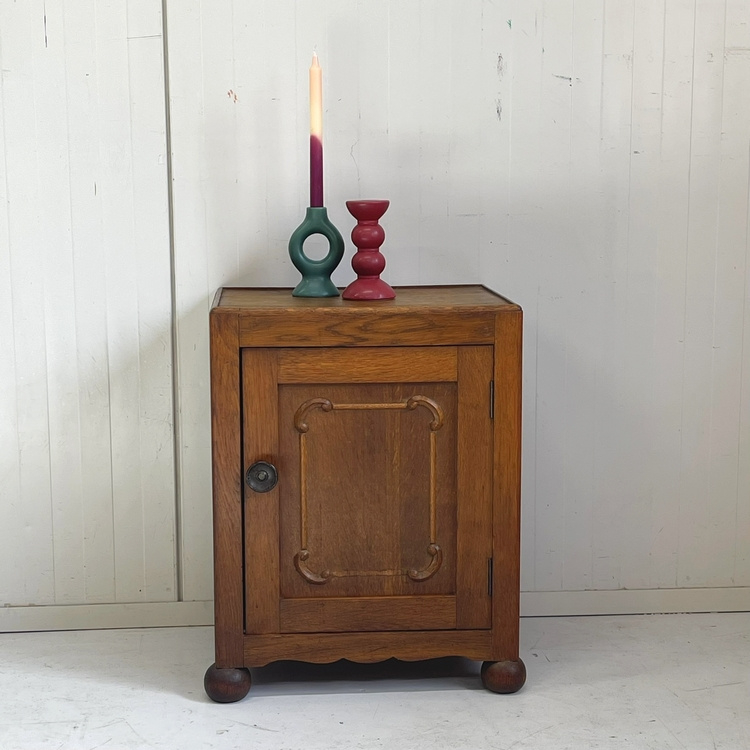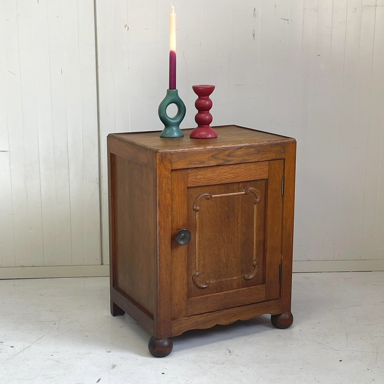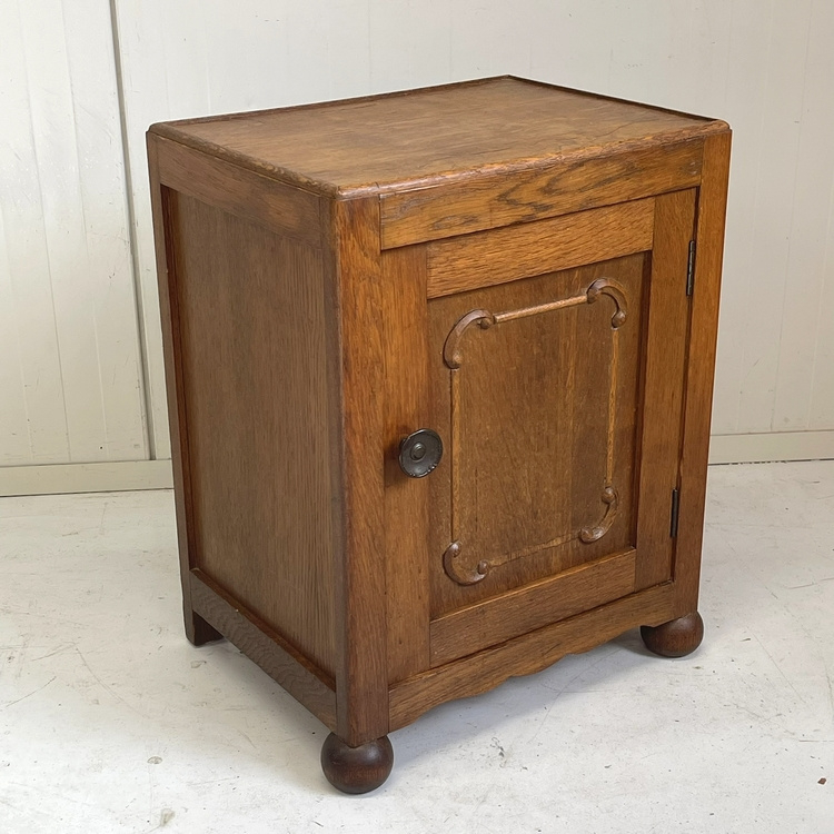 Artikelnummer: 3110 OverzichtAntiek eiken nachtkastje, fraai model op bolpootjes, verder strak met op het paneeldeurtje een subtiel houtsnijwerkje. Op het deurtje zit een sierlijke koperen knop.