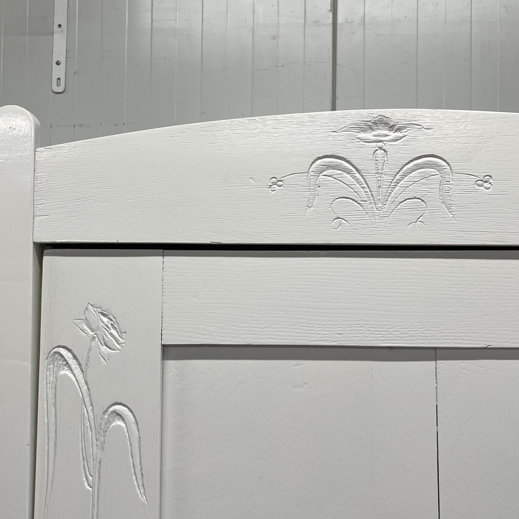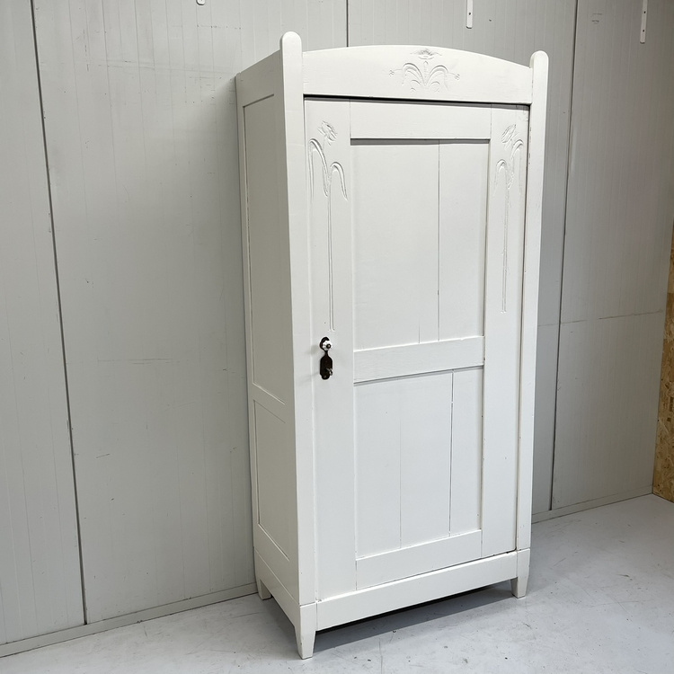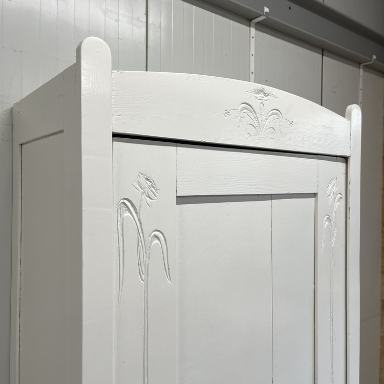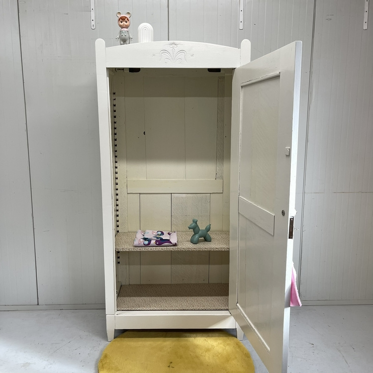Massief houten brocante Art Deco style kledingkast. Uitgevoerd met één paneeldeur. Op de ronde rand bovenaan en de zijpanelen naast de deur zit een fraai (subtiel) bloem houtsnijwerk. Binnenin zit een legplank, we hebben er een roede in gemaakt, want die ontbrak. Staat van de grond op rechte pootjes en heeft een werkend slot. De kast is schoongemaakt en helemaal nagelopen. Leuk voor op de kinderkamer, maar ook als opbergkast in de living een leukerd !