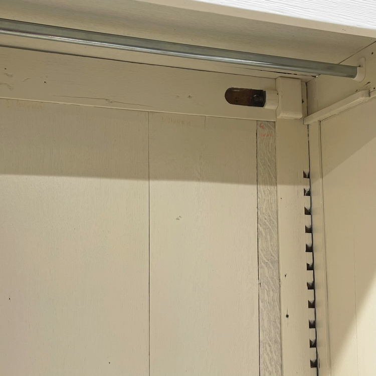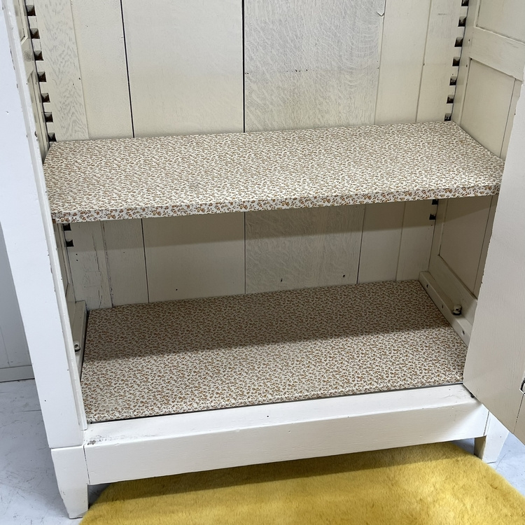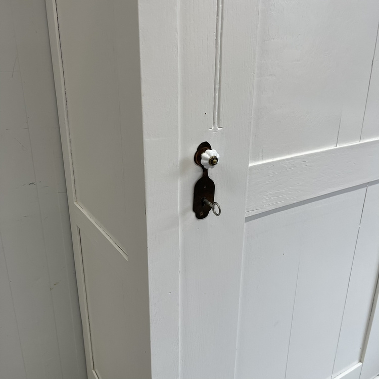 Verkeert in nette conditie, het witte schilderwerk heeft wat kleine sporen van gebruik, maar niets schokkends. In de deur zitten wat verticale paneelscheuren, heel normaal voor een dergelijke kast. Staat solide en is, indien gewenst, te demonteren. De achterwand bestaat uit diverse losse panelen, dus even puzzelen met het monteren. We hebben daarom alles netjes gemerkt.