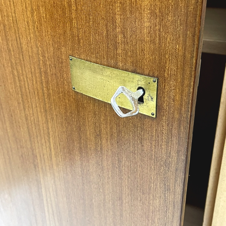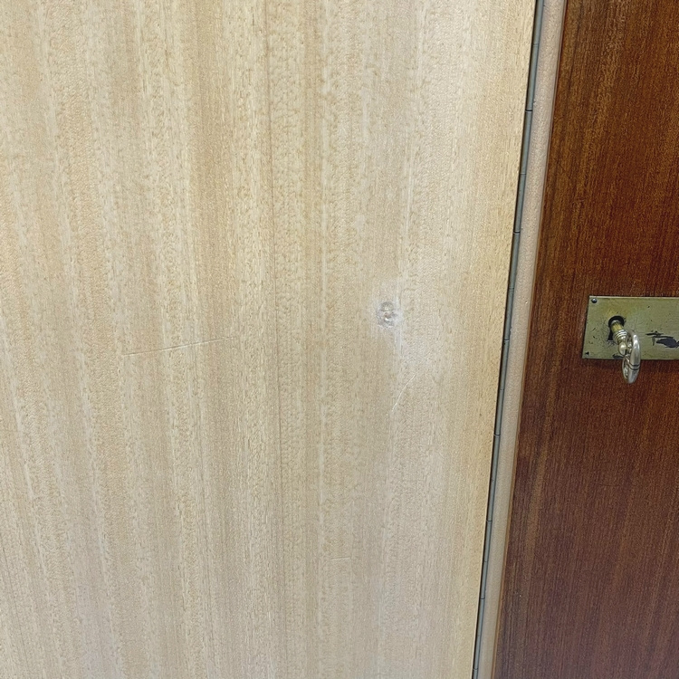 De kast is schoongemaakt en helemaal nagelopen en verkeert in solide staat met normale sporen van gebruik passend bij de leeftijd. In de middelste deur zitten wat plekjes, onderin op de linkerdeur zit een putje met kras. Dit en wat kleine fineerplekjes zijn netjes op kleur bijgewerkt. De achterwanden zijn verstevigd door de vorige eigenaar d.m.v. een horizontale lat aan de achterkant, hier zie je de schroefjes van. Foto`s spreken voor zich. De sloten werken, er zitten 2 sleutels bij en de deuren sluiten mooi.