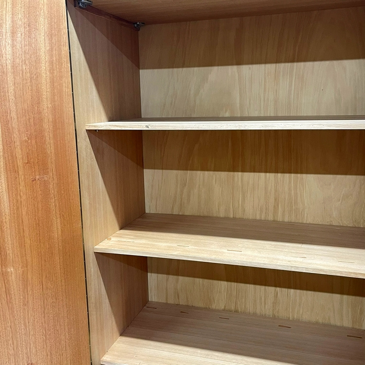 De kast staat op kekke schuine pootjes en mooi strak van vorm. Boven de deuren zit een subtiel horizontaal randje onder het dak, dit komt terug in de schildjes van de sloten.  Binnenin zitten 3 royale legplanken achter de linker- en midendeur. Rechts zit een roede. Tegen een meerprijs van 35 euro per plank zijn hier extra legplanken te maken (van gebruikt hout, we streven er naar in ons bedrijf om zoveel mogelijk her te gebruiken).