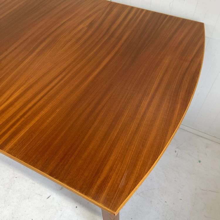 Artikelnummer: 3119 OverzichtMooie strakke vintage jaren 6o eettafel ! Heeft (afneembare) schuine poten en een iets rondlopend blad aan de korte kanten. Uitgevoerd in een warm eikenfineer met een iets lichtere rand erom heen. Is nagelopen en schoongemaakt en verkeert in goede stevige conditie. Het blad heeft wat krasjes hier en daar en op de randjes zit wat schade, verder heel normale sporen van gebruik. Is behandeld met een voedende houtolie.
