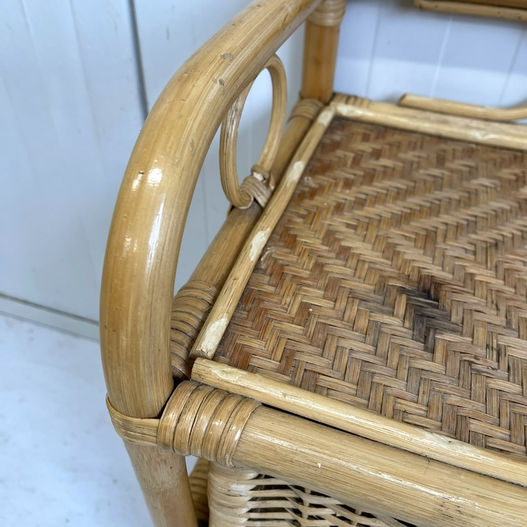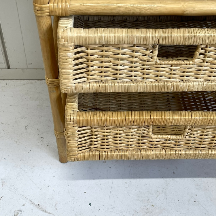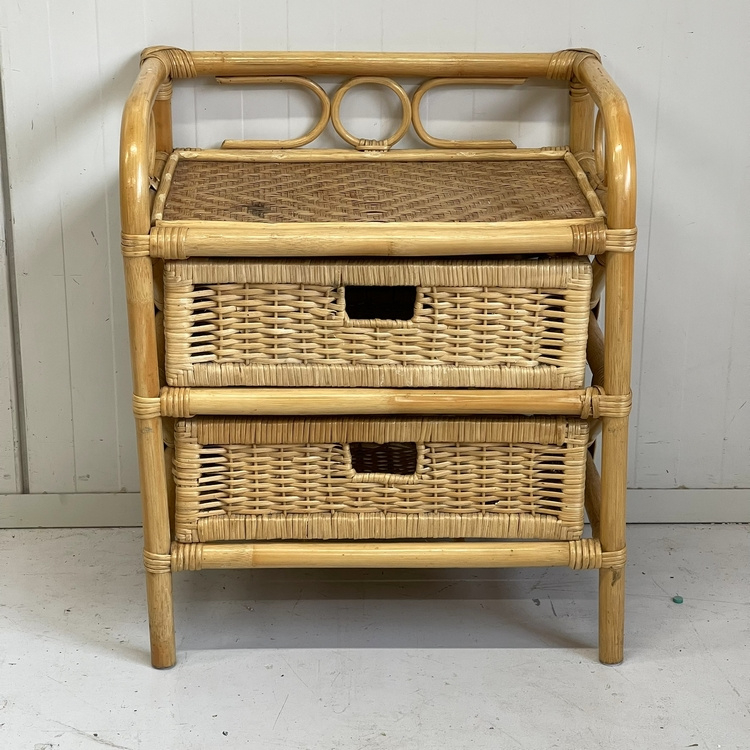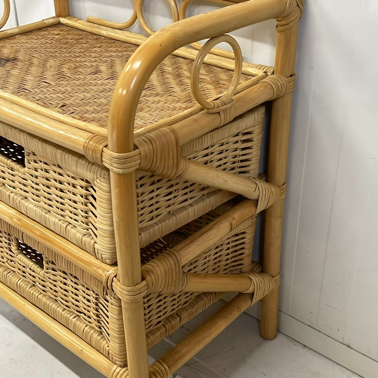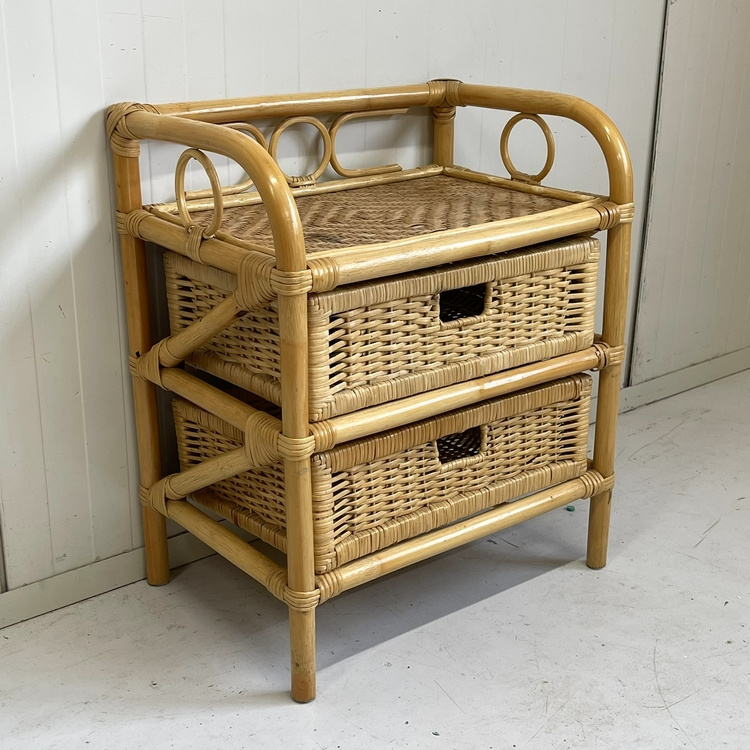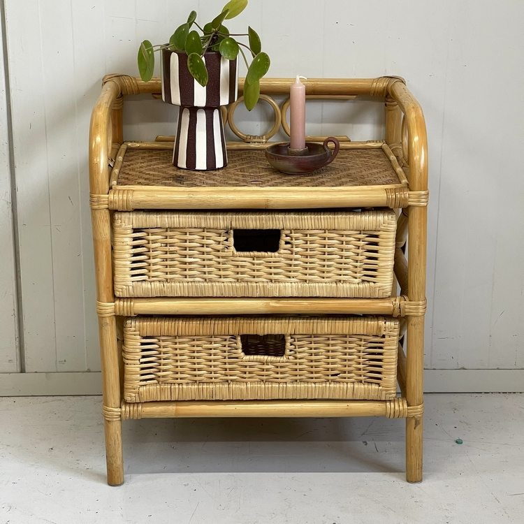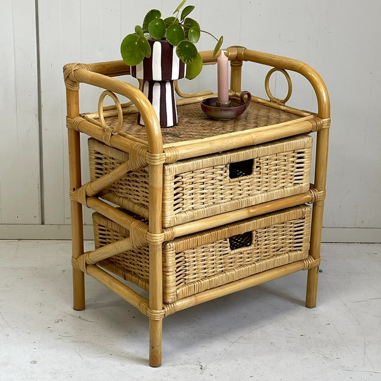 Artikelnummer: 3121 OverzichtVintage rotan ladekastje uit de jaren 70/80. Het heeft 2 laatjes en een opstaande rand. Verkeert in stevige, nagelopen conditie, met normale lichte sporen van gebruik, het blad heeft een zwart vlekje, zie foto`s. Rotan is verder heel.