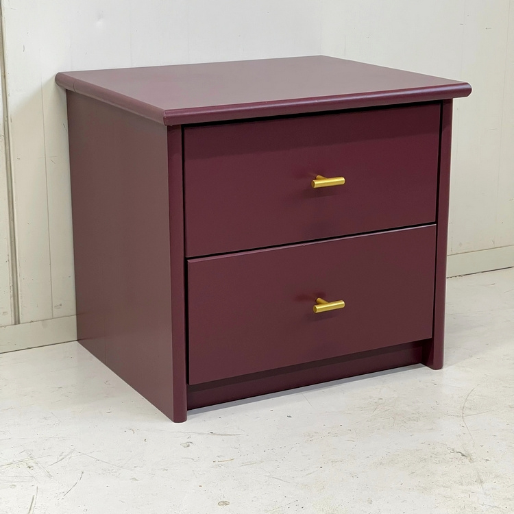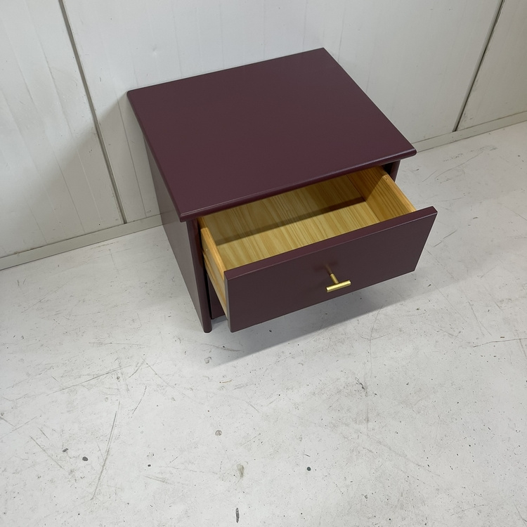 Artikelnummer: 3123 OverzichtRestyle ladekastje, mooi compact en strak van vorm. We hebben het geschilderd in een diep aubergine `Brinjal` van Farrow & Ball in een zijdeglans. En er nieuwe T greep koperen knoppen op gezet. Een mooi geheel. Leuk als nachtkastje, maar ook in de hal voor je sleutels etc. handig....