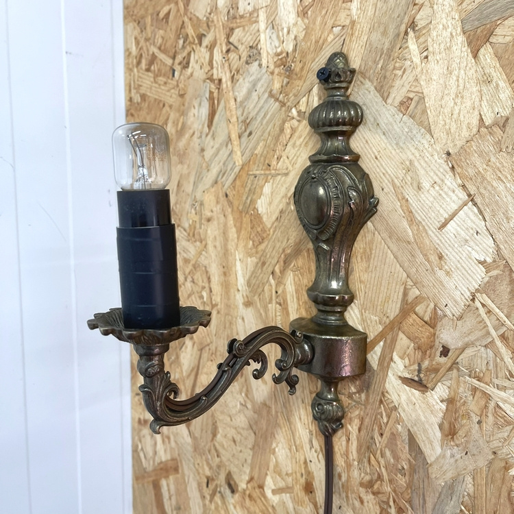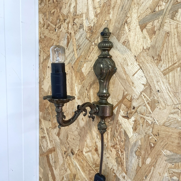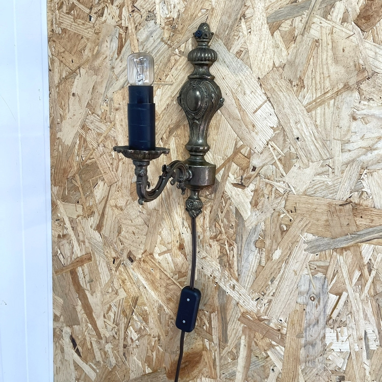 Artikelnummer: 3128 OverzichtVintage koperen wandlampje. Met mooie sierlijke details. Het `kaarsje` is ooit netjes beplakt met zwart tape. We hebben de bedrading vervangen door een nieuw (gebruikt) snoer met een nieuw schakelaartje en stekker met randaarde. Uiteraard is het getest, exclusief het lampje op de foto.