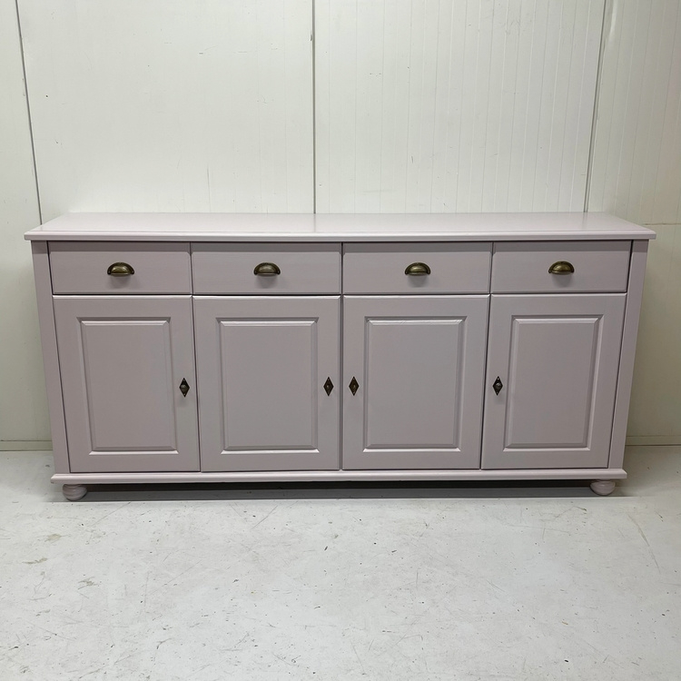 Artikelnummer: 3133 OverzichtMassief houten royaal dressoir met lekker veel opbergruimte ! We hebben het met liefde en passie weer helemaal van nu gemaakt, het is geschilderd in een lila-roze tint `Peach Blossom` van Little Green in een zijdeglans. Het heeft 4 paneeldeuren met erboven 4 lades. Is voorzien van bronskleurige komgrepen. De 2 middelste deuren hebben het originele slot met sleutel, van de 2 buitenste werkten deze niet meer, deze sluiten d.m.v. een magneetslotje en hebben een eveneens bronskleurig, knopje gekregen.