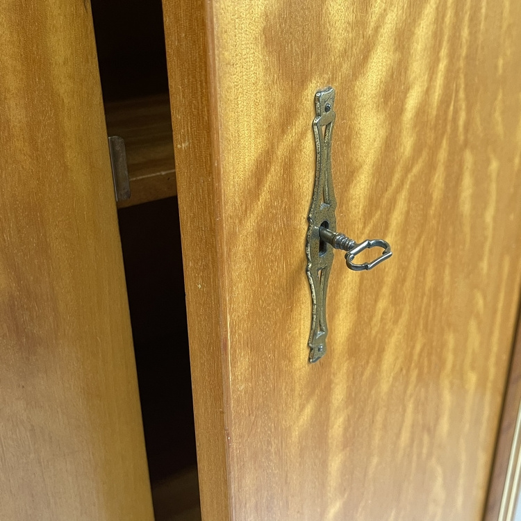 De kast staat op kekke schuine pootjes en is strak van vorm. Achter de middelste- en rechterdeur zitten 3 legplanken en achter de linkerdeur zit een roede. Tegen een meerprijs van 35 euro zijn hier een of meerdere legplanken te genereren. Geef dit even aan bij je bestelling. De kast kan op slot (er zitten 2 verschillende sleutels bij) en er zitten koperen slotplaatjes op. De deuren sluiten mooi. Naast de deuren zit een verticale lat met subtiele koperen lijntjes, zie foto`s.