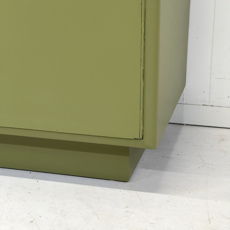 Artikelnummer: 3136 OverzichtVintage kubus model nachtkastje uit de jaren 60. We hebben het opgeknapt en het geschilderd in een warm olijfgroene kleur (zelf gemeng). En voorzien van een nieuw messing greepje.