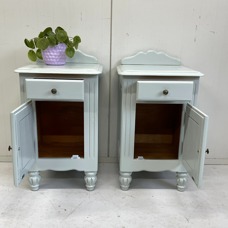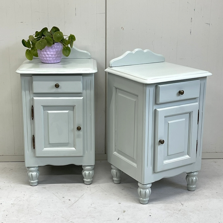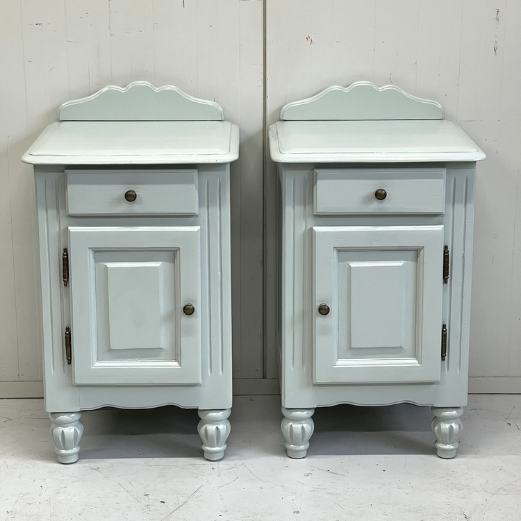 Artikelnummer: 3137 OverzichtSet van 2 vintage brocante massief houten nachtkastjes, zijn door ons eerst helemaal nagelopen en schoongemaakt en daarna geschilderd in een blauwgroen-grijze tint in een hoogglans. De kastjes hebben mooi bewerkte pootjes, paneeldeurtjes en een sierplankje op het blad aan de achterkant (die kan er ook af indien gewenst). Naast de deurtjes zit een verticaal paneel met subtiel werkje. Zijn voorzien van bronskleurig hang- en sluitwerk. Deuren en lades sluiten mooi.