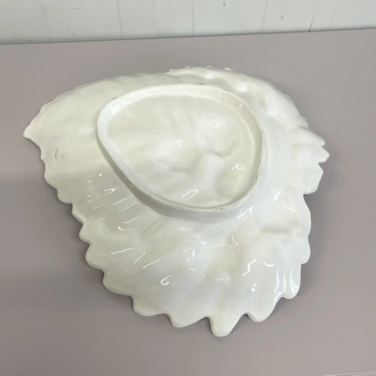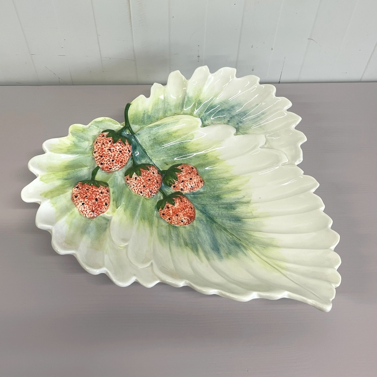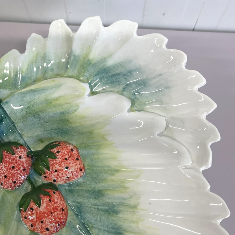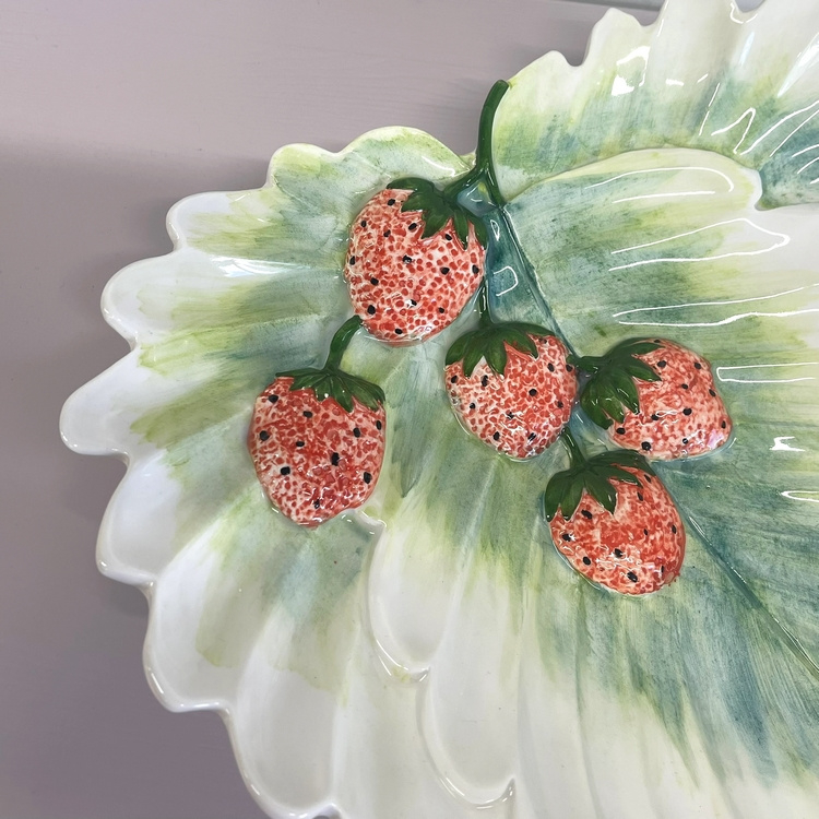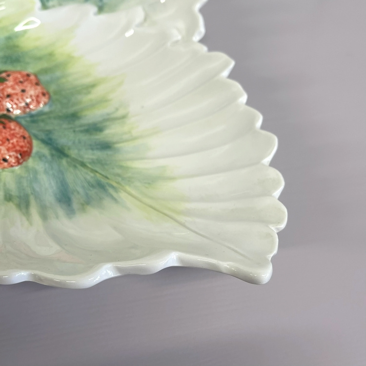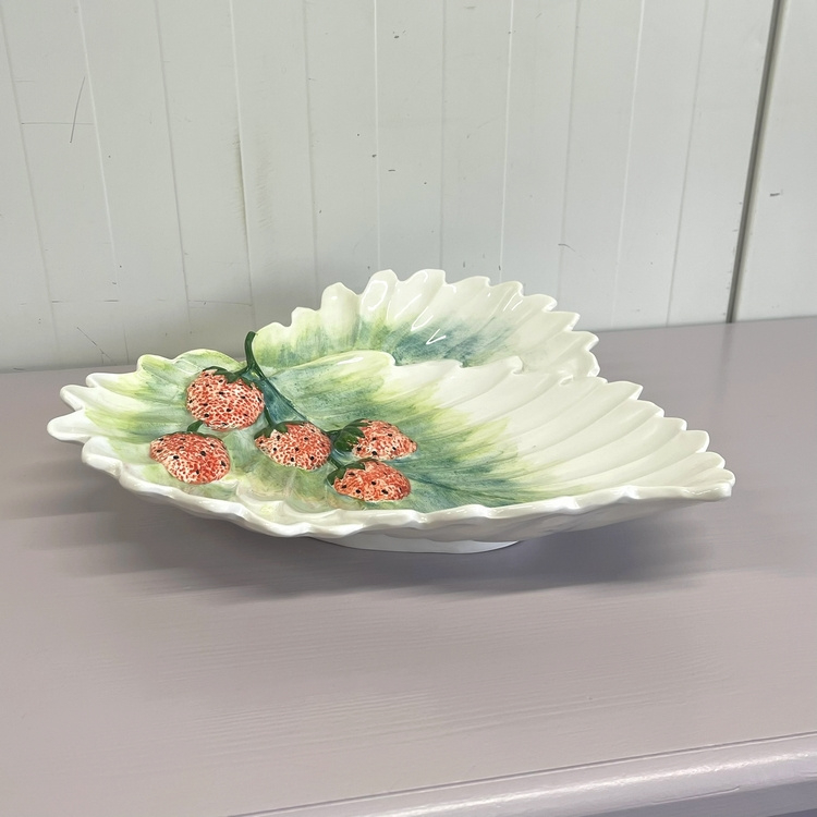 Prachtige aparte serveer/fruitschaal uit Italië. Met patroon van aardbeien en in de vorm van een blad. Verkeert in zeer goede conditie en is een lust voor het oog :-)