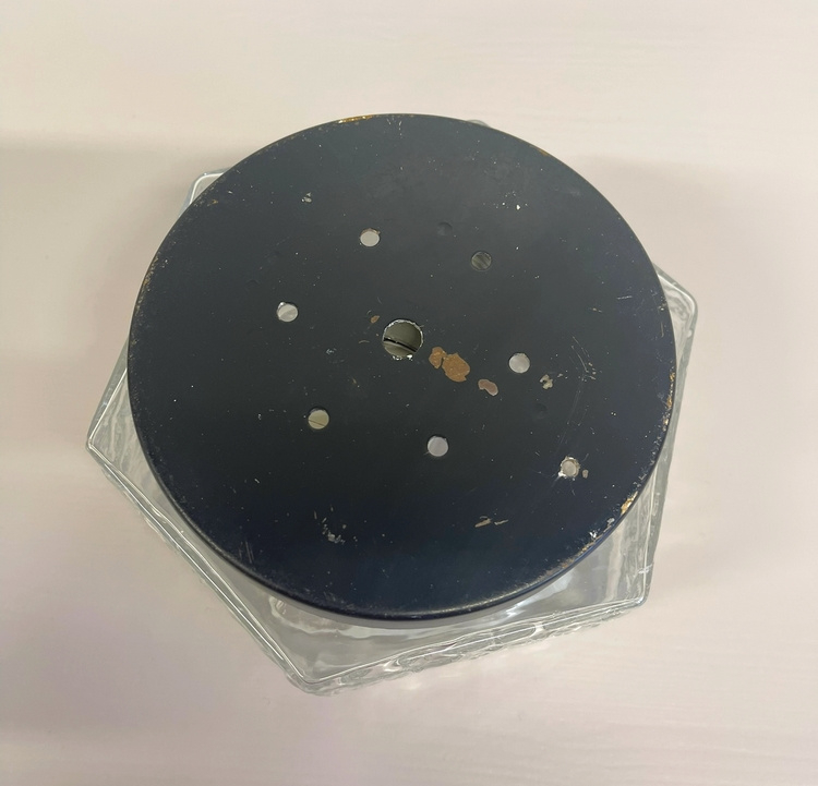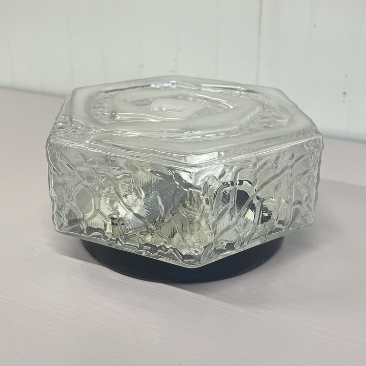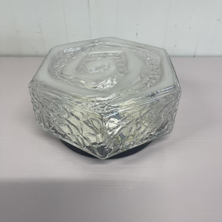 Glazen vintage Art Deco plafonniere, uitgevoerd met mooi patroon in doorzichtig en melkglas met metalen zwarte rand. In mooie conditie !