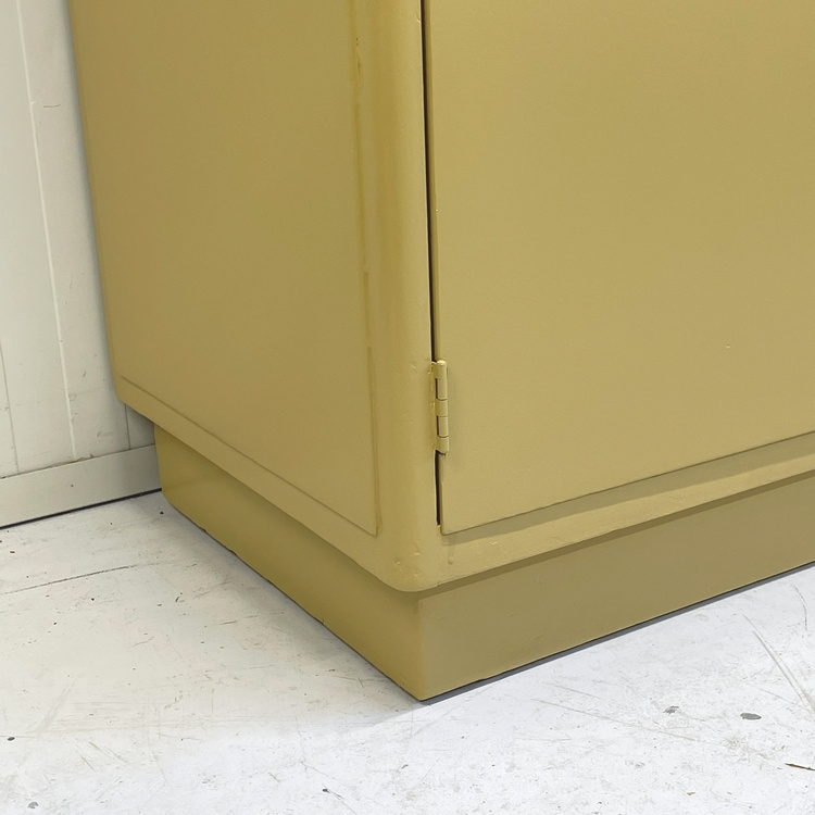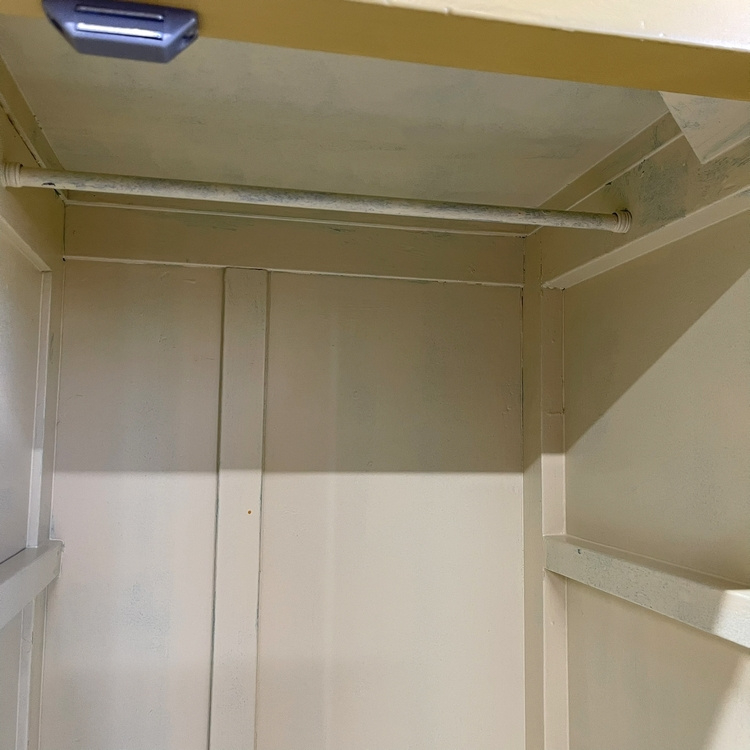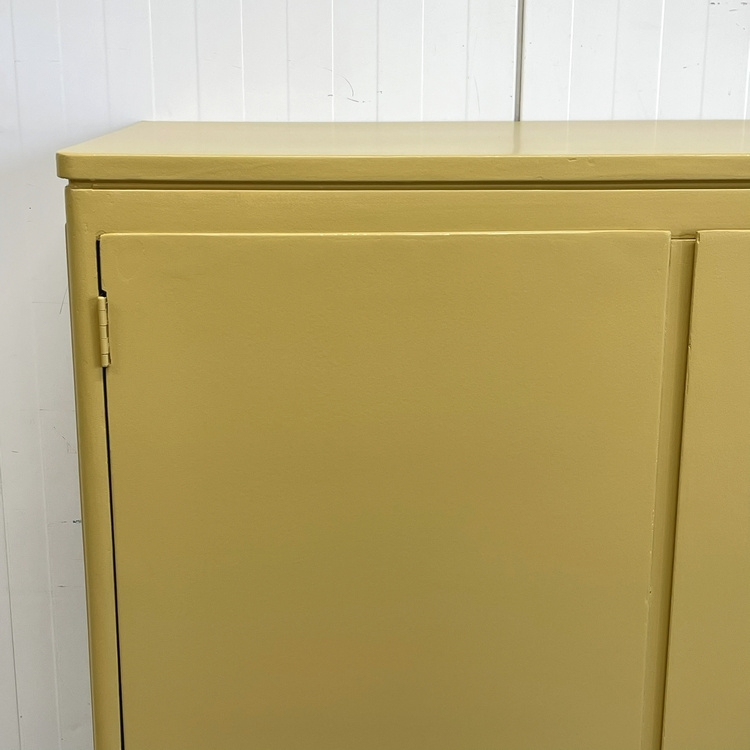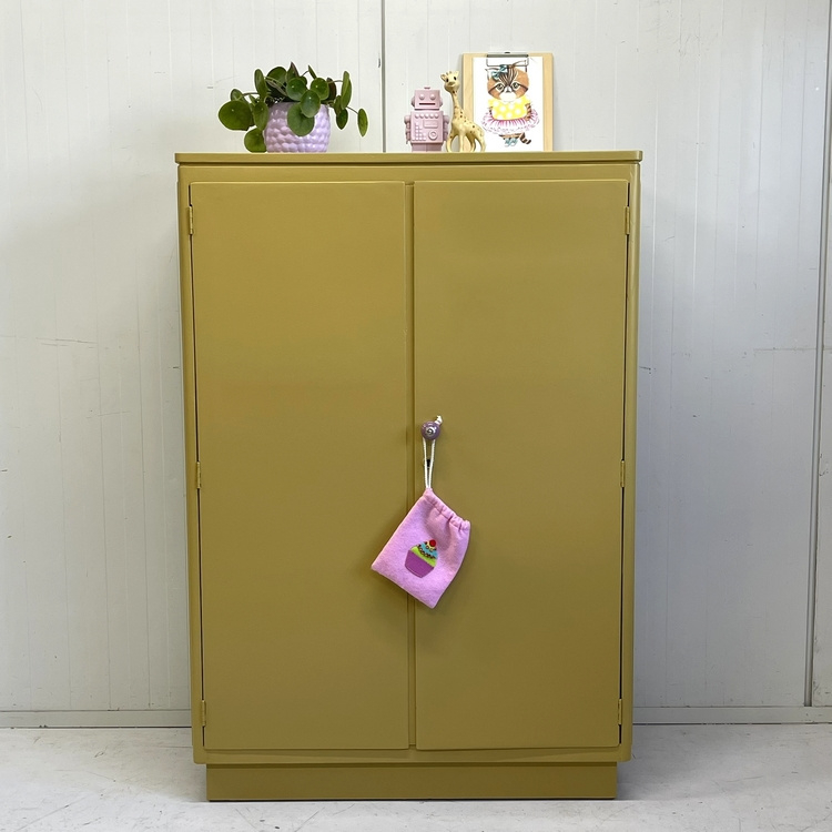 Achter de 2 deuren zit links een deel met 3 legplanken en een lade. Rechts zit een roede met onderin nog een legplank. De vorige eigenaar had hem recent al geschilderd in deze warme lichte okergele tint (in werkelijkheid is de kleur iets lichter en romiger, was lastig te vangen) en dit ziet er nog heel goed uit. Qua netjes sluiten was er nog wat werk aan. We hebben de deuren passend gemaakt en er nieuwe schuifjes, magneetje en een paars porseleinen knop in gemaakt. De deuren sluiten netjes en de lade loopt soepel. De binnenkant is niet geschilderd en is een beetje sleets hier en daar. De kast staat op een iets terugvallende plint.