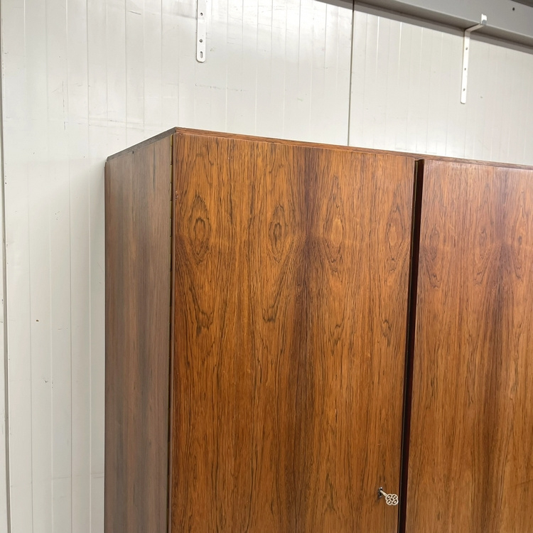 Artikelnummer: 3139 OverzichtStrakke vintage jaren 60 demontabele 3 deurs kledingkast, uitgevoerd in een warm licht pallisander fineer !