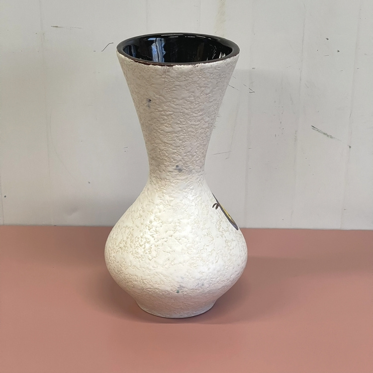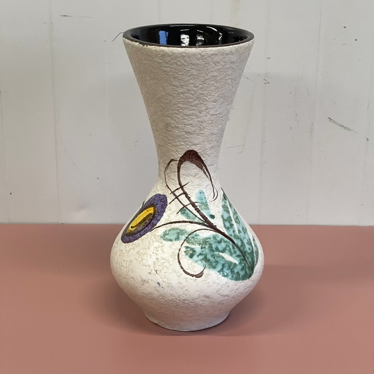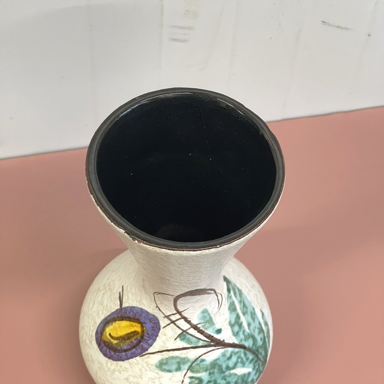 Artikelnummer: 3154 OverzichtVintage WG Scheurich vaas. Zie je niet zoveel deze uitvoering :-) Offwhite achtergrond met decor in groen, zwart, paars en geel. In goede conditie, nergens schade, heeft alleen aan de achterkant wat vlekjes, zie foto.