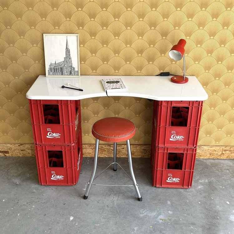 Artikelnummer: 928 OverzichtWat een gaaf bureau en uniek ! Het is gemaakt van 4 vintage Coca Cola kratjes, 2 x 2 aan elke kant, daar bovenop ligt een (gebruikt) blad met een kunststof laag. We hebben aan de onderzijde balkjes gezet, zodat het stevig in de kratjes verankerd zit. Desgewenst kunt je ook één laag kratjes verwijderen, zodat je een laag bureau-tje hebt voor een kleuter/kind. Nu is het ook prima te gebruiken door een volwassene. Het geheel is demonteerbaar voor vervoer en evt. trapgat.