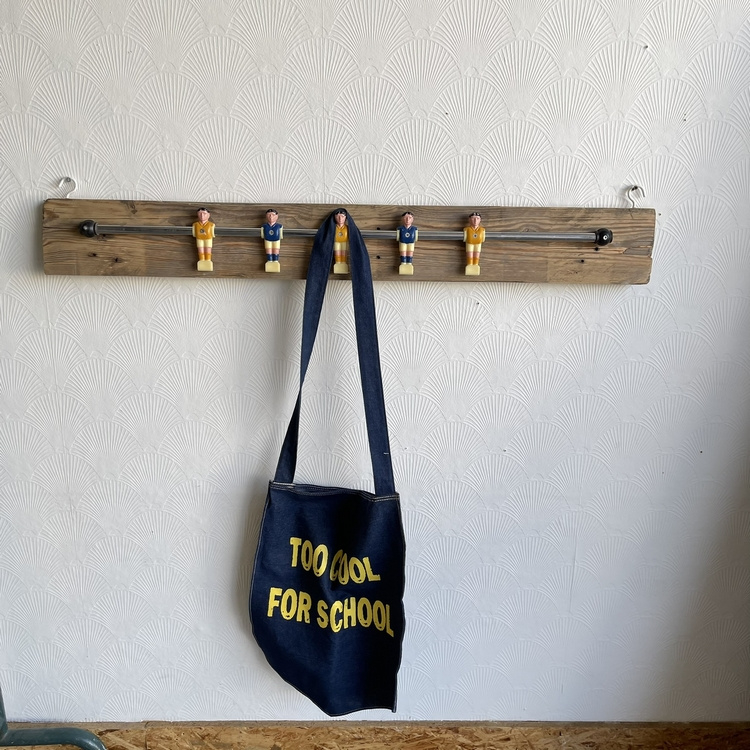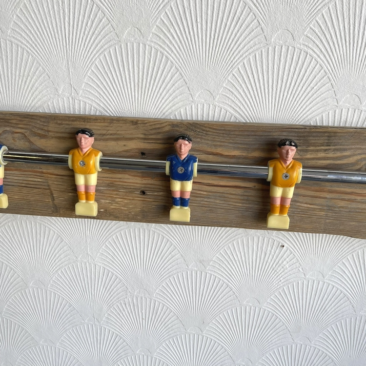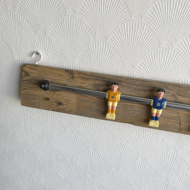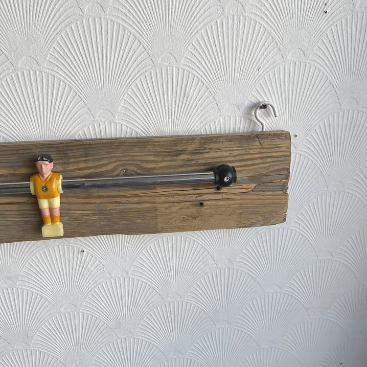 Artikelnummer: 1570 OverzichtVoetbalkapstok, eigen ontwerp, gemaakt van een plank sloophout & een stang van een vintage tafel voetbal spel met poppetjes in geel & blauw. Voorzien van 2 ophanghaken.