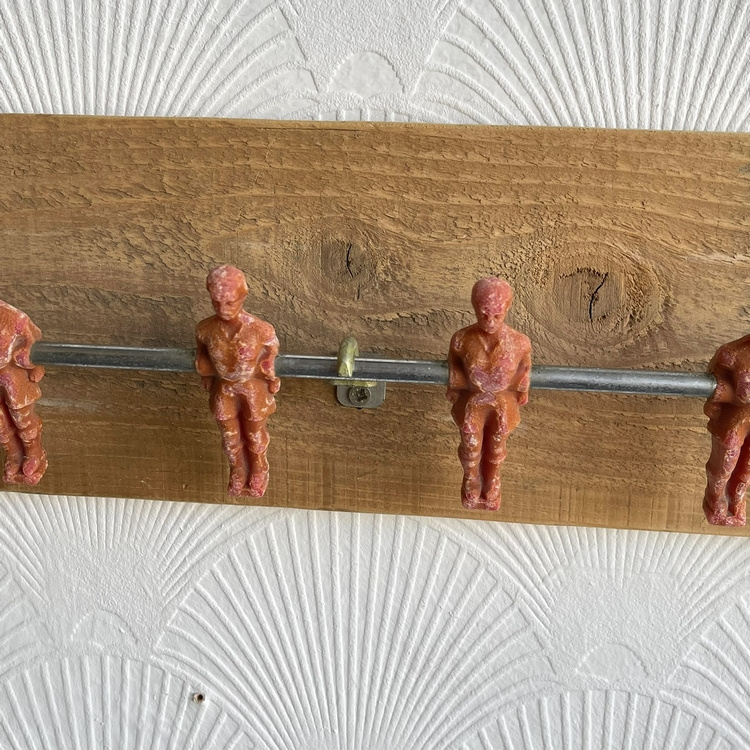 Artikelnummer: 1571 OverzichtKapstok, gemaakt van een plank sloophout en een stang van een heel oud tafel voetbal spel met de poppetjes en handvatten. Eigen ontwerp, dus een echte blikvanger :-) Er zitten 2 ophanghaken aan.