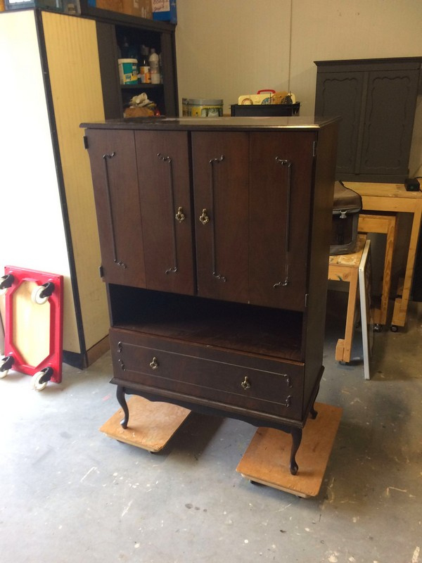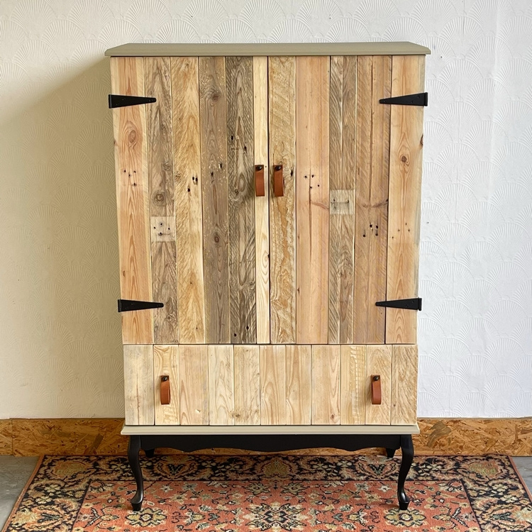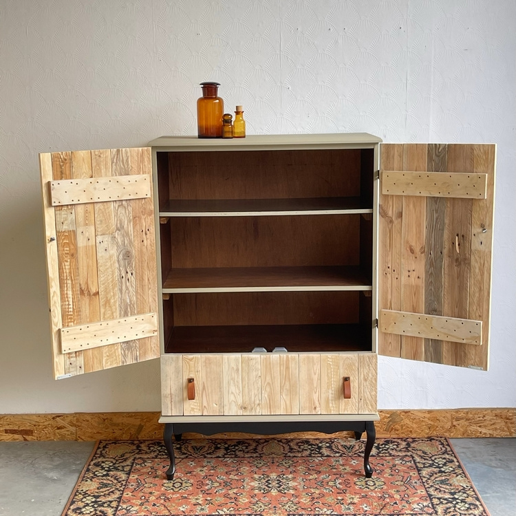De deuren en de klep zijn eraf gehaald en er zijn nieuwe deuren en een opnieuw gemaakte lade van sloophout in allerlei naturellen, in gemaakt. De binnenkant is helemaal gestript, hier zijn 2 legplanken te vinden, rustend op een stevig balkje. Als hang- en sluitwerk zijn er nieuwe zwarte metalen scharnieren op gekomen en cognackleurige leren greepjes met zwarte bout. De onderkant van de kast met de barok pootjes is zwart geschilderd, de rest van de kast is lindegroen geschilderd met matte krijtverf. Het voorste randje van de legplanken is ook meegenomen in die kleur.
