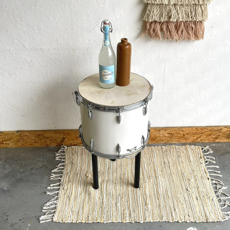 Artikelnummer: 1740 OverzichtUpcyclingprojekt; deze oude trommel/drum hebben we in onze werkplaats een make-over gegeven. Aan de boven- en onderkant hebben we een houten plaatje bevestigd en er vervolgens zwart metalen poten onder gezet. Voilà, het is een supergaaf bijzettafeltje geworden ! Het houten blad is behandeld met een wax, zodat het tegen vocht etc. bestand is. De trommel zelf is helemaal schoongemaakt.